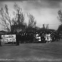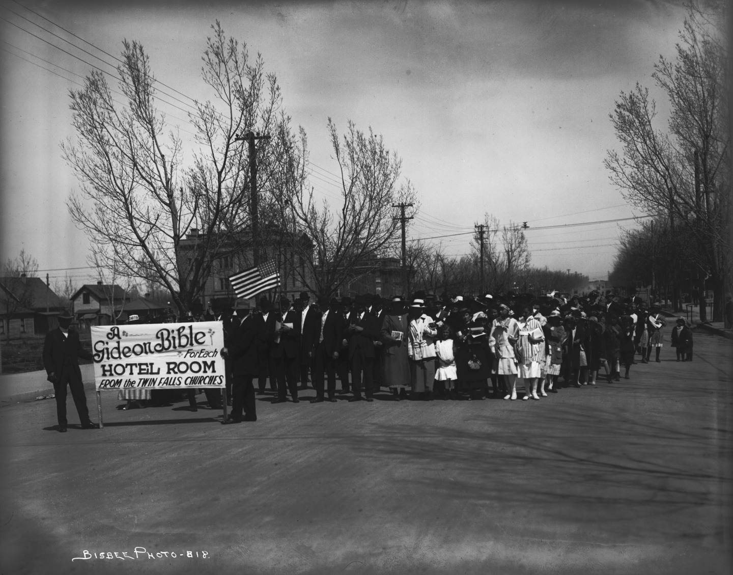 - Group of people parading on Shoshone Street in front of the Twin Falls County Court House and Twin Falls High School with a sign reading "A Gideon Bible for Each Hotel Room from the Twin Falls Churches;" also visible in the background is Washington School
