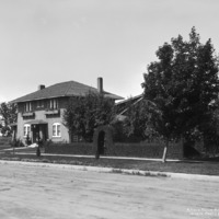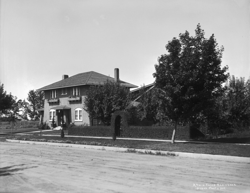 - "A Twin Falls Residence;" two-story stucco house, landscaped with trees and decorative shrubbery; sidewalk along road in front of the house