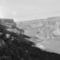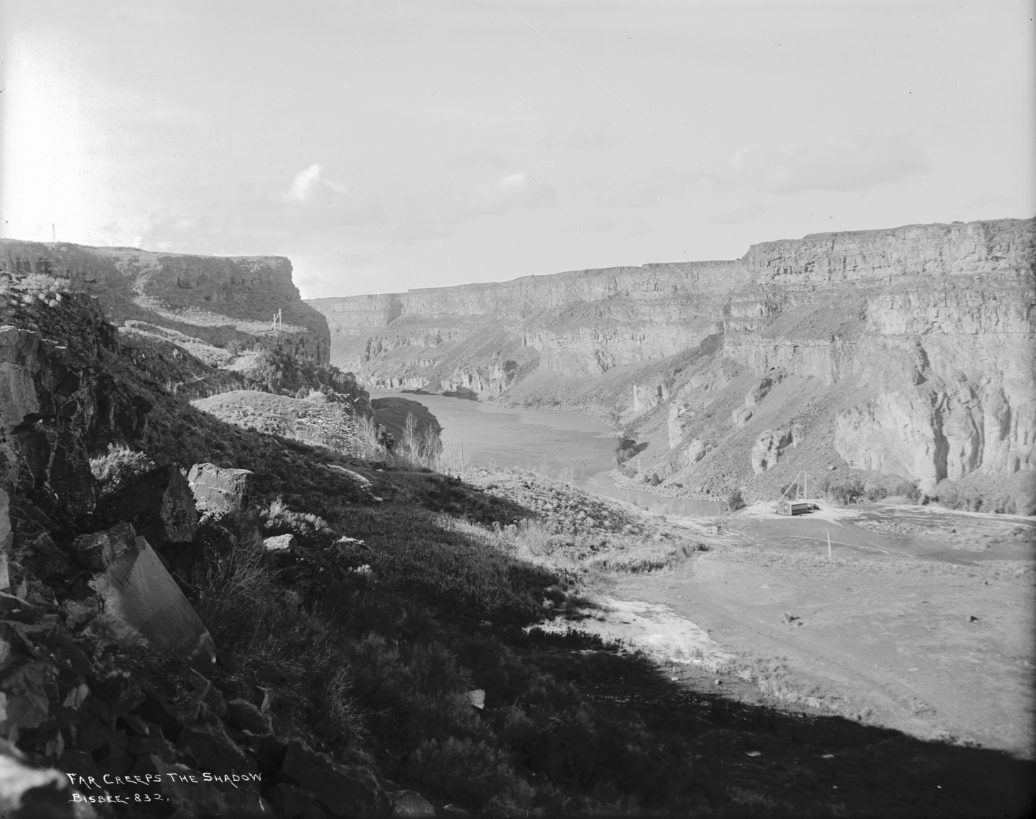 - "Far Creeps the Shadow;" canyon wall projecting shadows; building on bluff of canyon floor on right