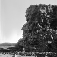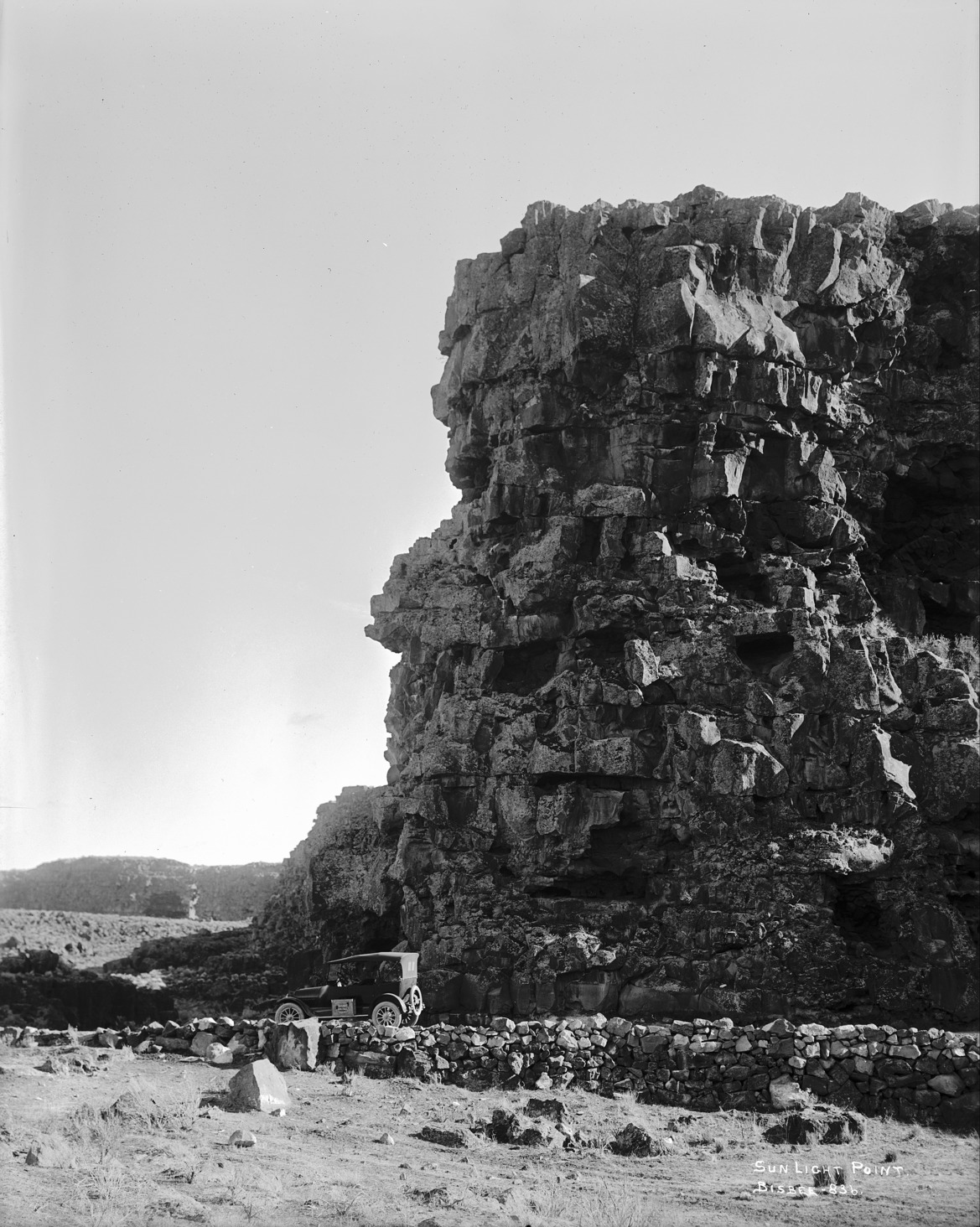 - "Sunlight Point;" automobile (with a trunk on running board labeled Bisbee Studio, Twin Falls) stopped below a rock cliff on the floor of the canyon