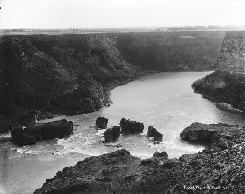 - "Pillar Falls;" view of area upstream from the Shoshone Falls; rim of canyon and trees visible