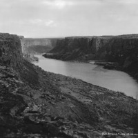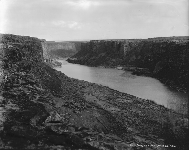 - "Old Spring Town;" view of the Snake River (Spring Town was a gold mining settlement in the 1880-1890s)