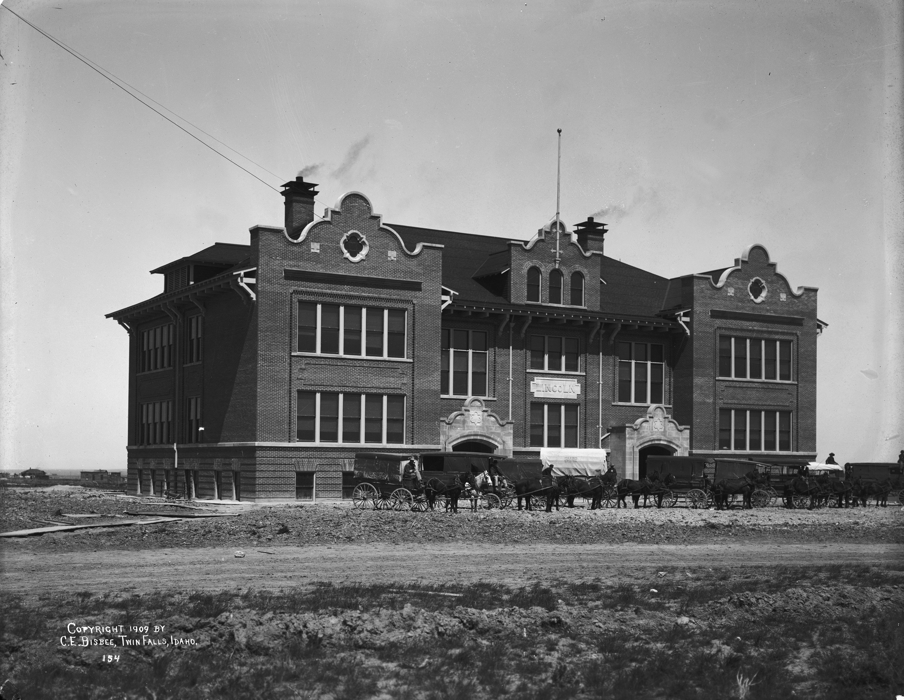 - Wagon teams waiting to transport students at Lincoln School, soon after its construction. (This building was demolished in 1975.)