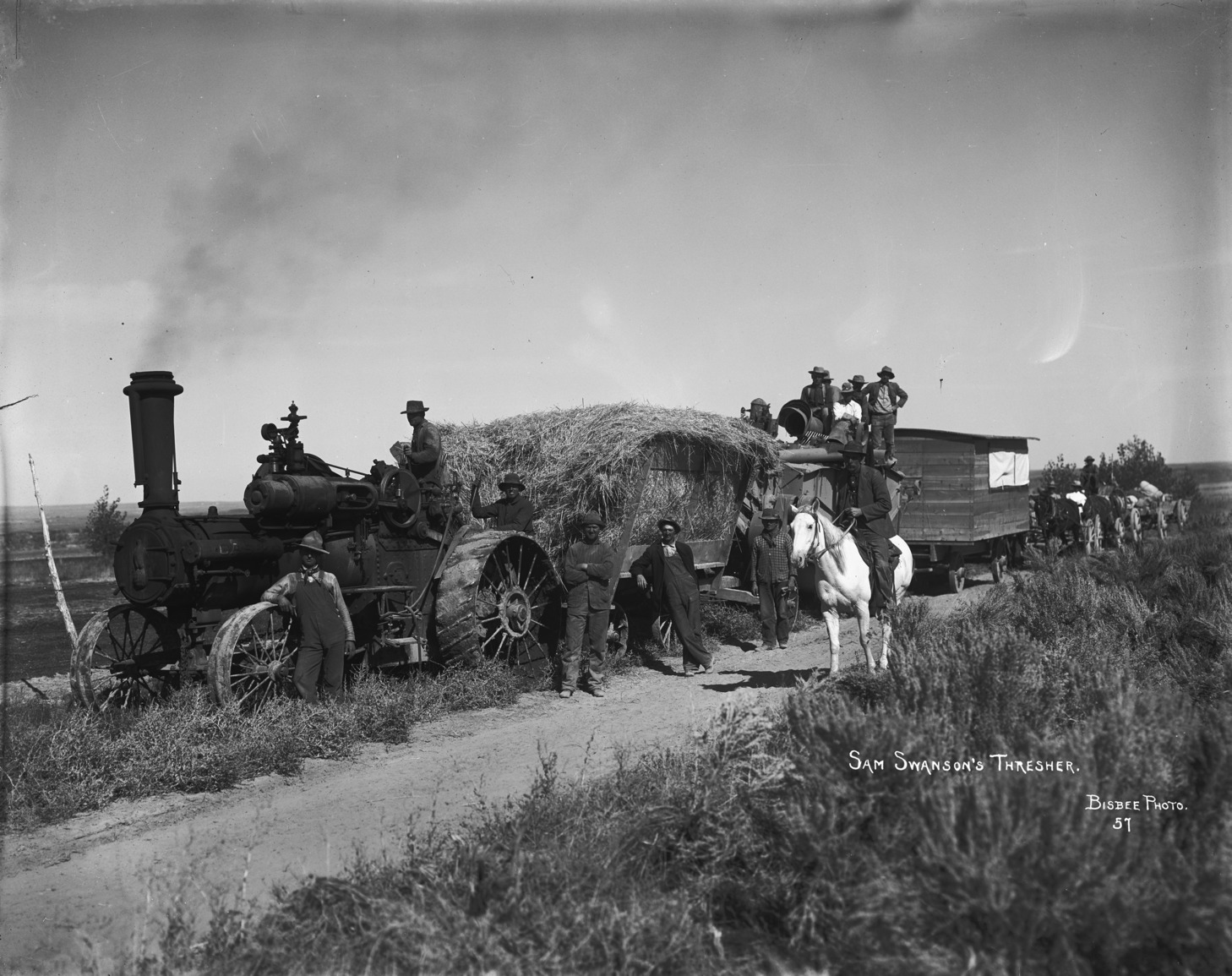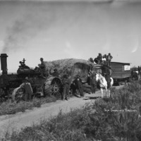 - "Sam Swanson's Thresher;" A group of men posing with steam engine thresher. Horses and wagons also seen.