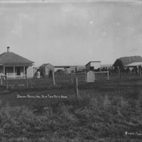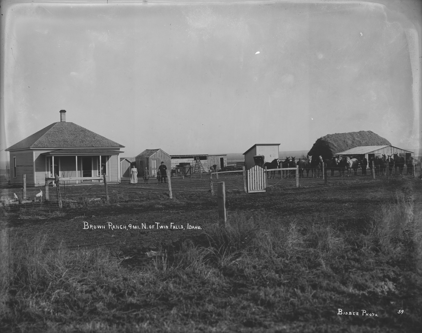 - "Brown Ranch, Nine Miles North of Twin Falls, Idaho;" Man, woman, and two children standing in a farmyard, with various outbuildings; large stack of hay/alfalfa; several horses with two men holding reins; chickens; buggy.