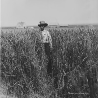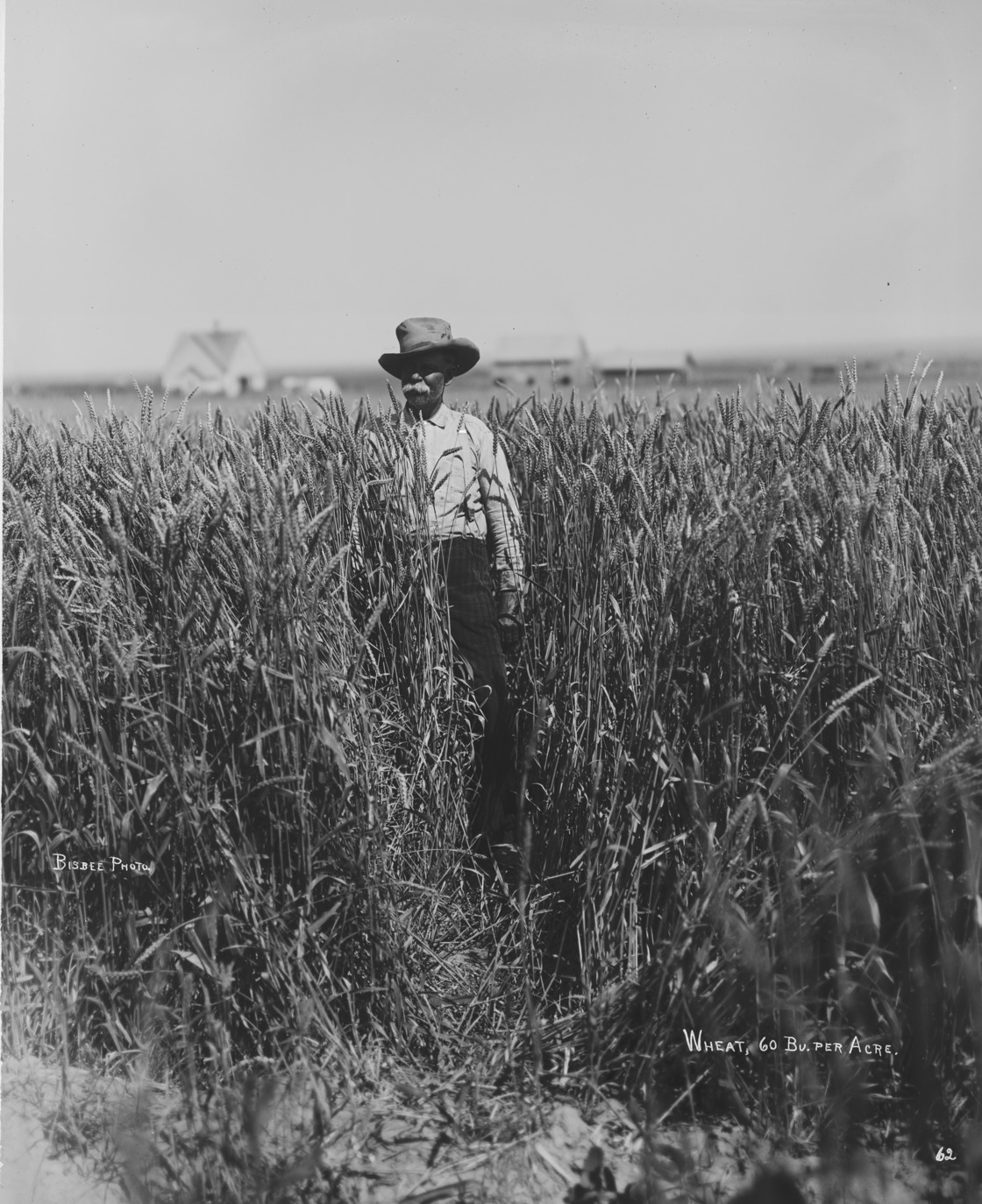 - "Wheat, 60 Bushels per acre;" Older man standing in tall wheat; house and farm buildings in the background.