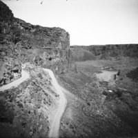 - A hairpin curve in the canyon road, with one of the Blue Lakes in the background