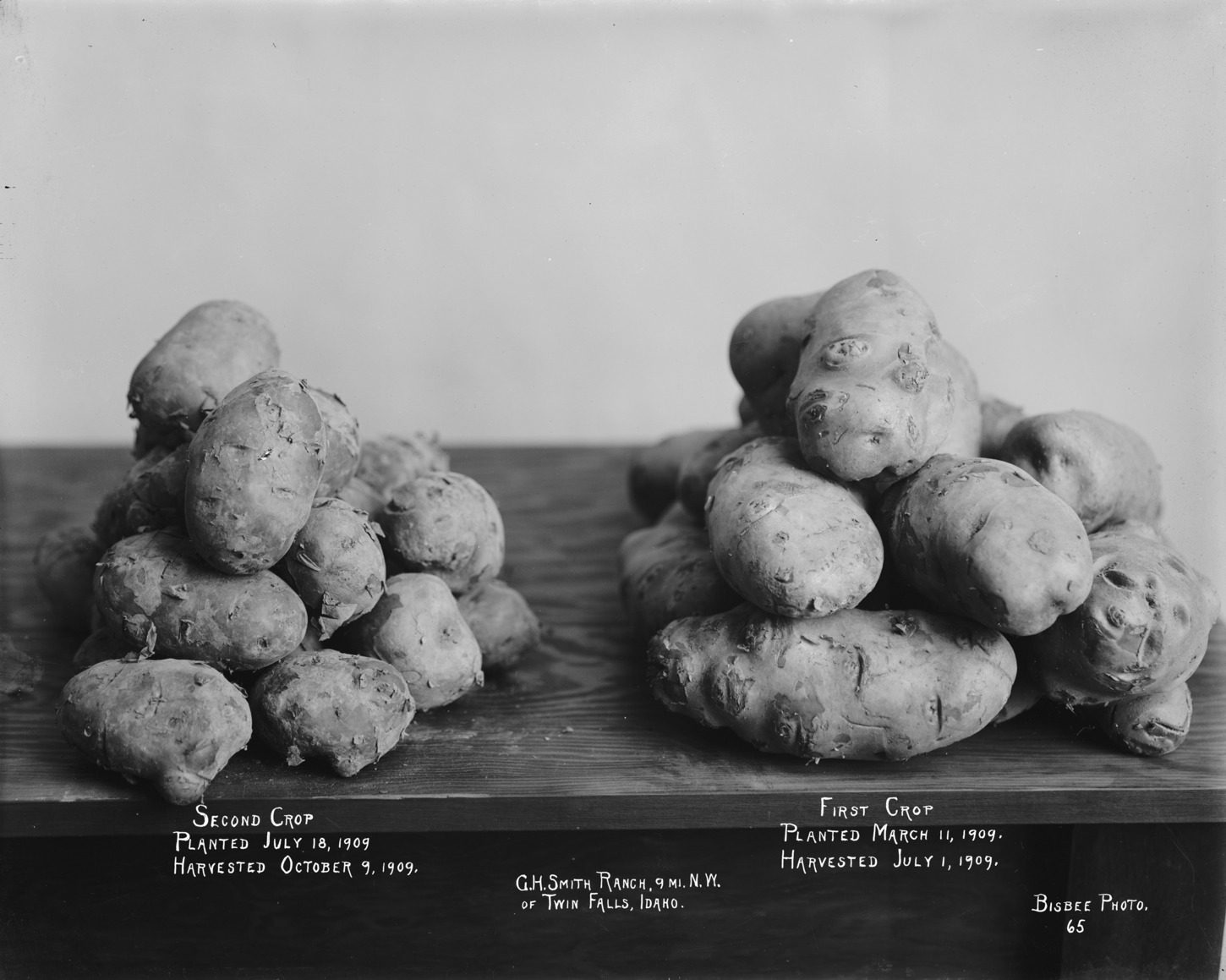 - G.H. Smith Ranch, 9 Miles Northwest of Twin Falls, Idaho; Second Crop Planted July 18, 1909, Harvested October 9, 1909; First Crop Planted March 11, 1909, Harvested July 1, 1909;" potatoes