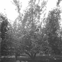 - "Apple Tree, Perrine Ranch;" Man in tree with buckets of apples on the ground; Snake River Canyon.