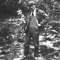 - "Hungarian Plums, Grown by I.B. Perrine;" Man standing with a branch of plums in his hand.