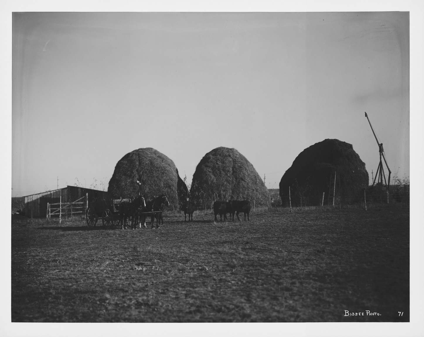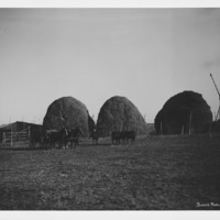 - A two-horse team, and cattle in a farmyard, with three stacks of loose hay and derrick in the background.