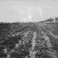 - "Strawberries, Grown by Senior, Twin Falls, Idaho;" Strawberry field between fruit trees, with buildings in the background.