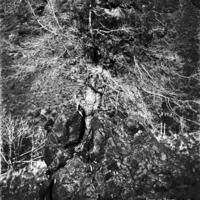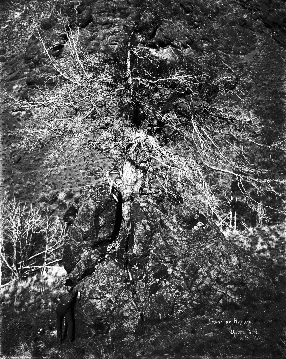 - "Freak of Nature;" gnarled tree growing out of lava rock; man standing beside