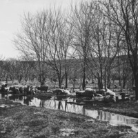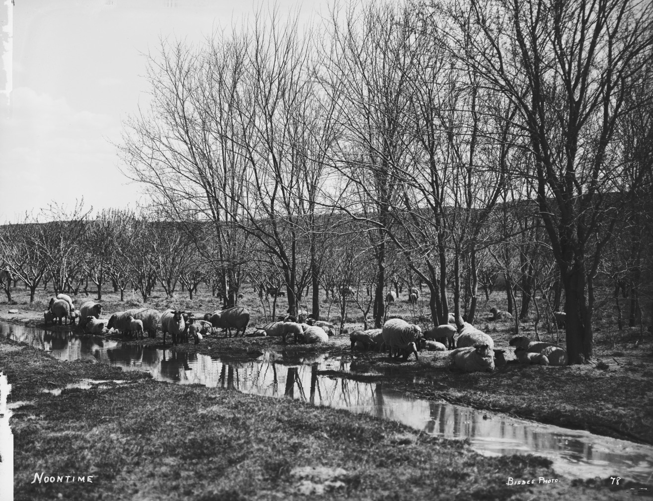 - "Noontime;" Sheep resting beneath fruit trees, alongside an irrigation ditch.