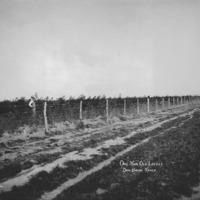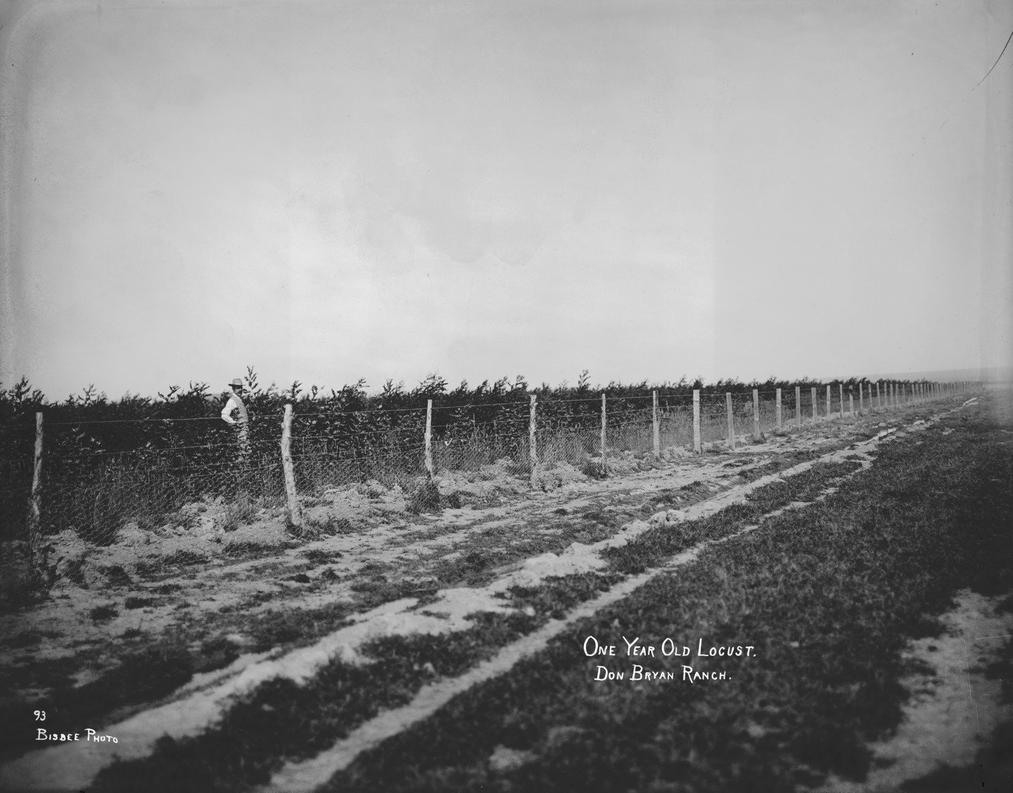 - "One Year Old Locust. Don Bryan Ranch;" Man standing among trees along a fence and dirt roadway.