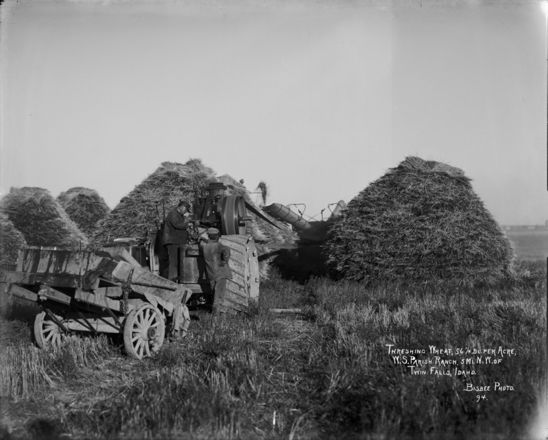 - "Threshing Wheat, 56 1/4 Bushels Per Acre, W.S. Parish Ranch, 5 Miles Northwest of Twin Falls, Idaho.