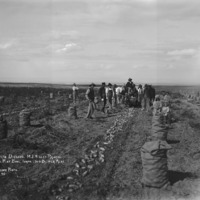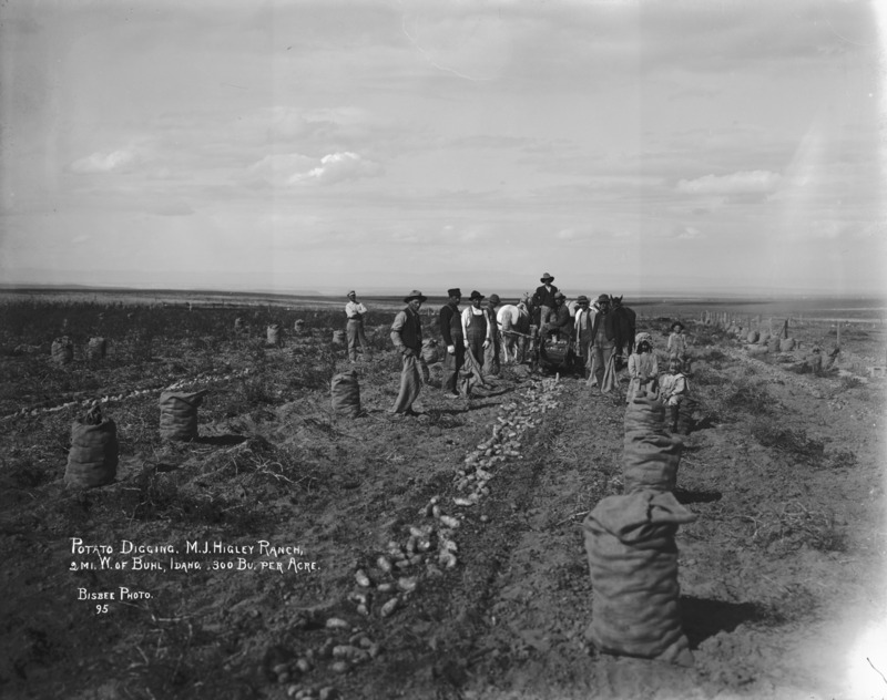 - "Potato Digging. M.J. Higley Ranch, 2 Miles West of Buhl, Idaho. 300 Bushels Per Acre;" Nine men and three children working around a wagon in a potato field; potato sacks.