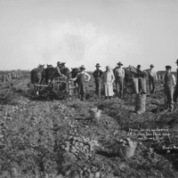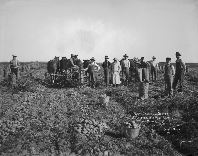 - "Potato Digger and Sorter, J.R. Newton, Twin Falls, Idaho. 400 Bushels Per Acre;" Ten men, women, and children working in a potato field with a four-horse team.