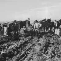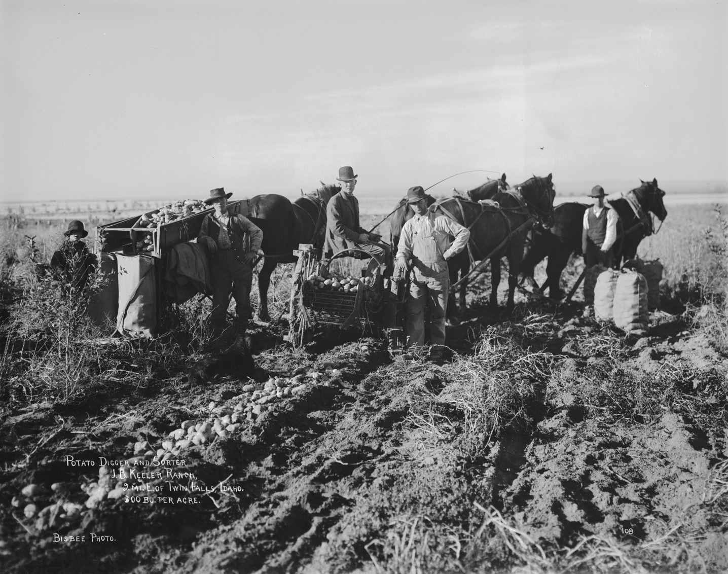 - "Potato Digger and Sorter, J.B. Keeler Ranch, 2 Miles East of Twin Falls, Idaho. 300 Bushels Per Acre;" Men and boys loading potatoes in a field, using wagons and teams.
