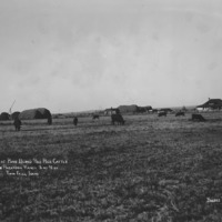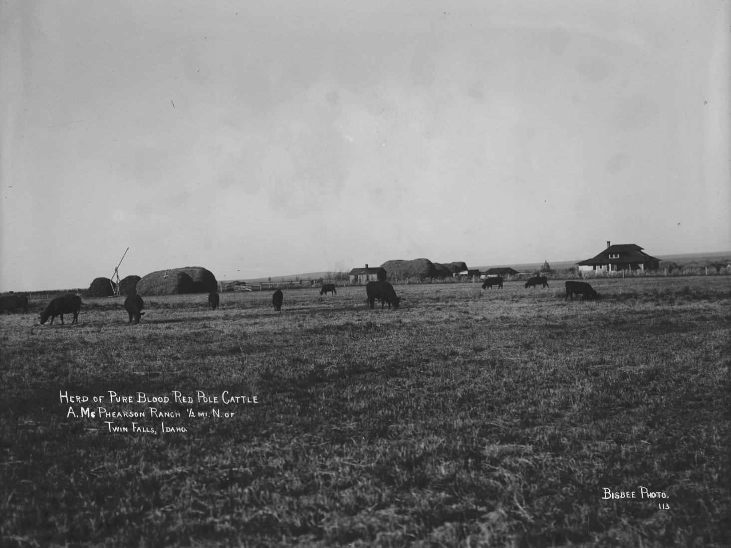 - "Herd of Pure Blood Red Pole Cattle, A. McPhearson Ranch, 1/2 Mile North of Twin Falls, Idaho;" Cattle in front of a farmstead and haystacks.