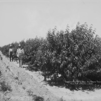 - "Three year old peach trees. A.J. Greene Ranch, 1 1/2 Miles Southwest of Twin Falls, Idaho;" Two men stand beside a row of peach trees.