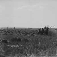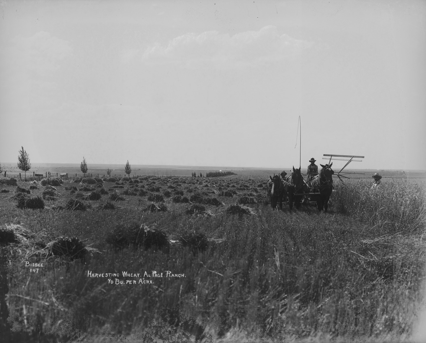 - "Havesting Wheat. Al Page Ranch. 70 bushels per acre;" Three men and a team of horses operating a reaper-binder in a wheat field; a road lined with trees in the background.