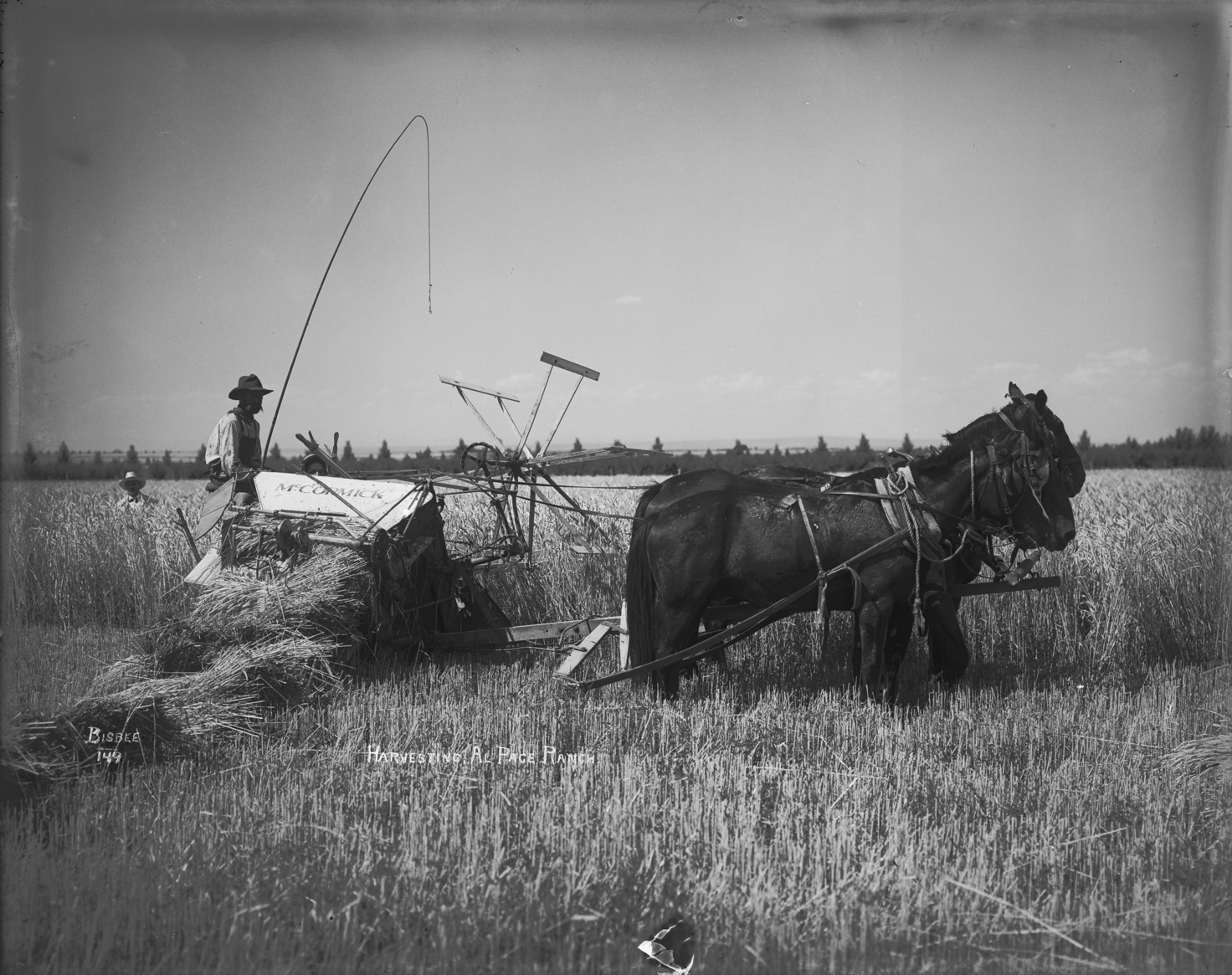 - "Harvesting. Al Page Ranch;" Two men and a team of horses operating a reaper-binder in a wheat field.