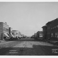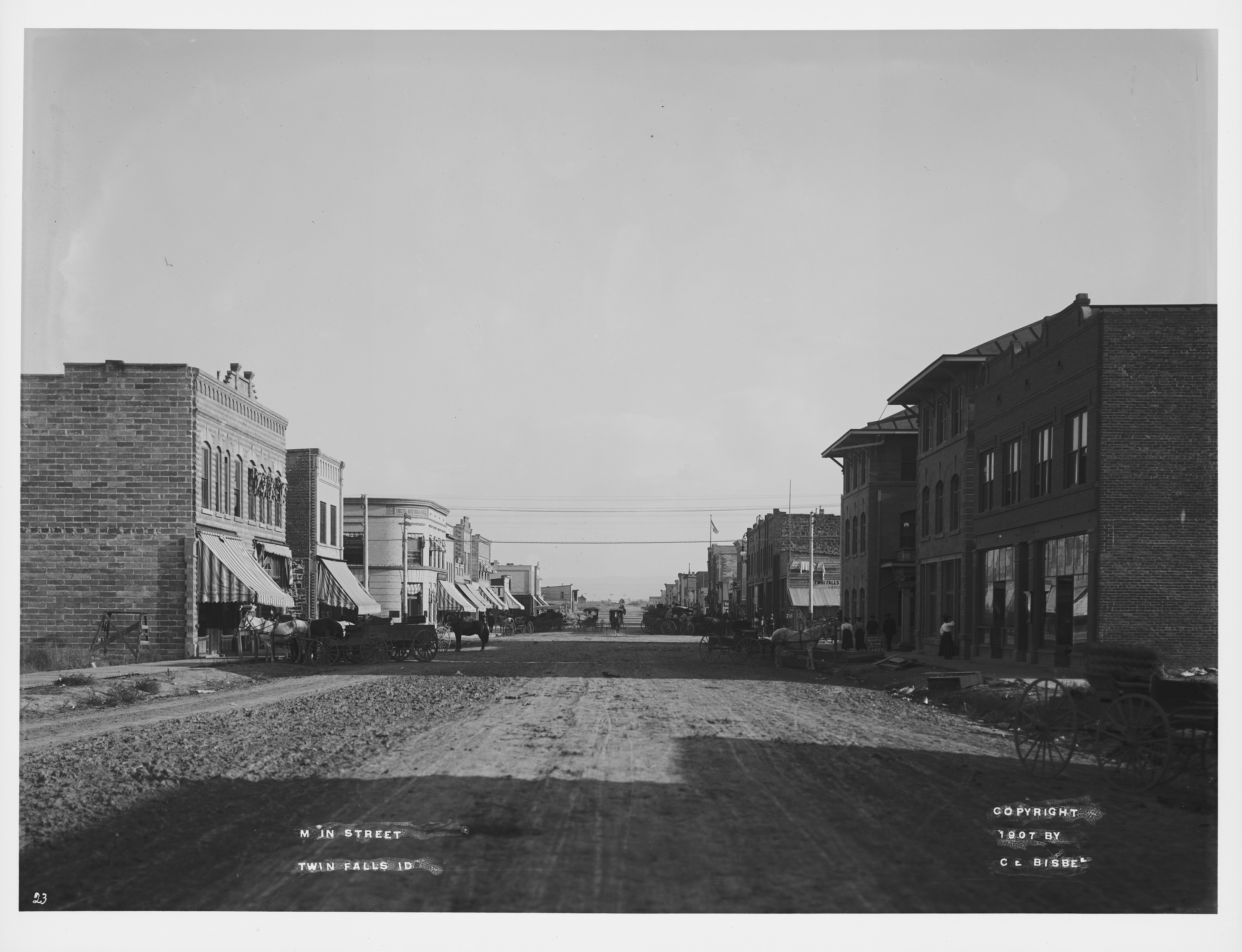 - "Main Street, Twin Falls, Id; Copyright 1907 by C.E. Bisbee;" looking southeast down Main Avenue and the intersection with Shoshone Street. Buildings seen include the Perrine Hotel and the First National Bank.