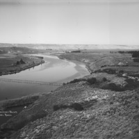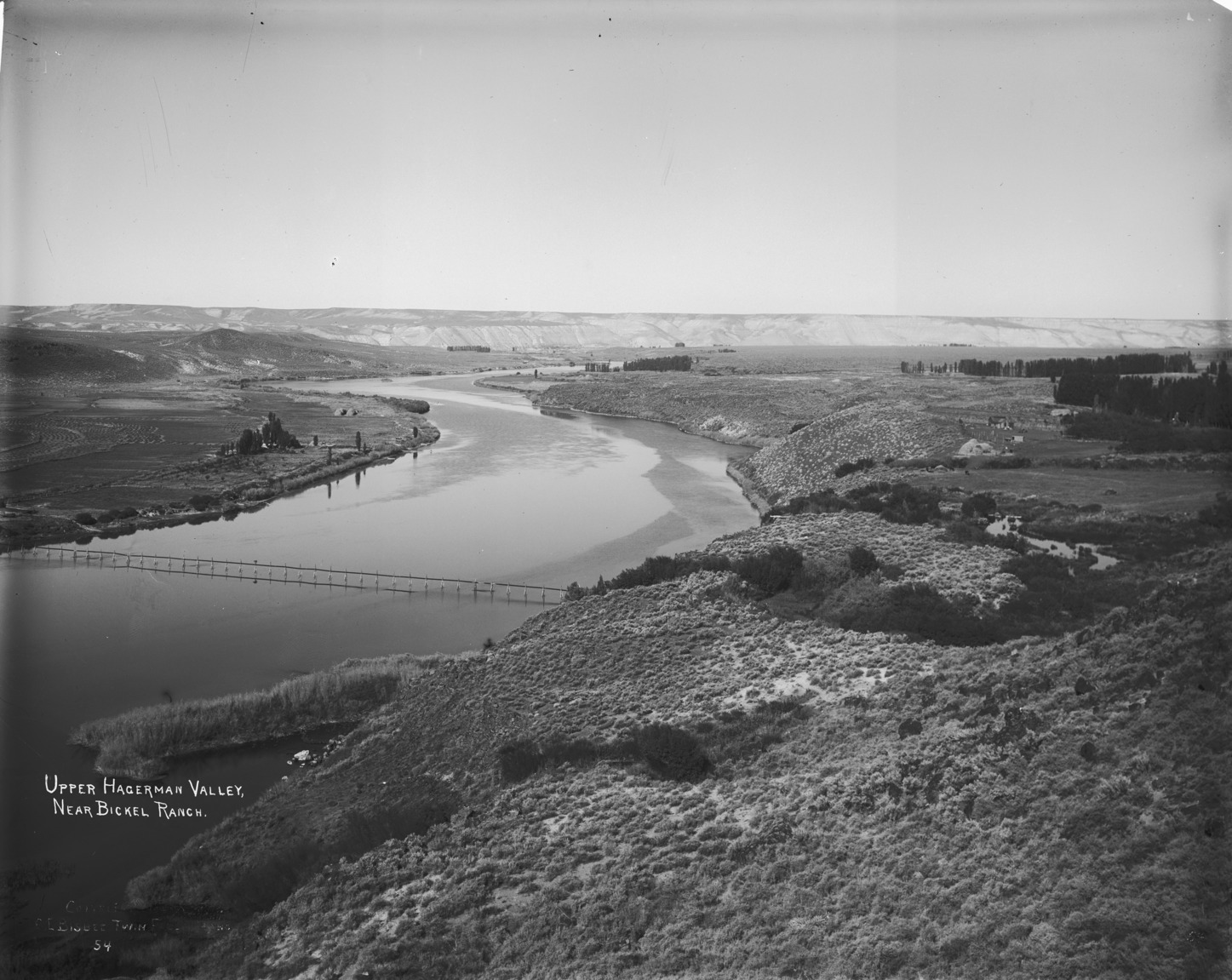 - "Upper Hagerman Valley, near Bickel Ranch;" the Snake River, trees, and a bridge.