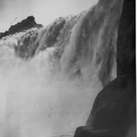 - "Shoshone Falls;" view from the base of the falls, with three men seated along the river.
