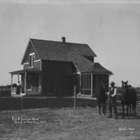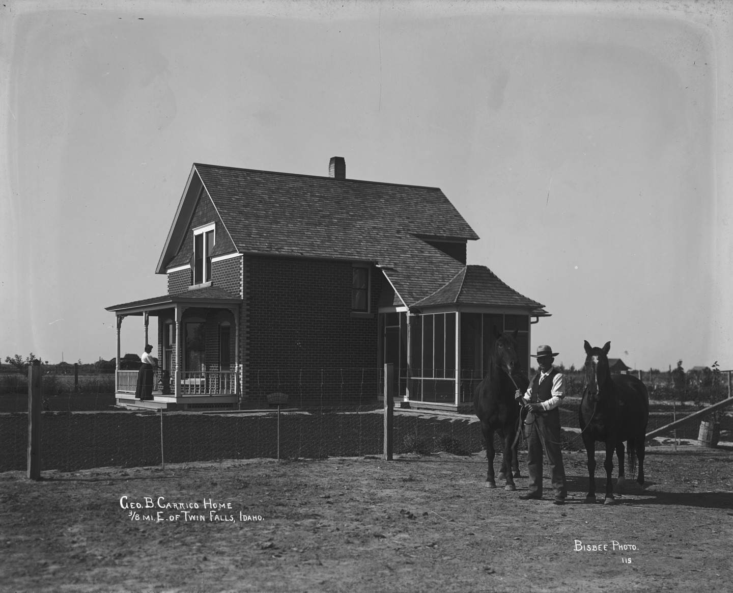 - "George B. Carrico Home, 3/8 mile east of Twin Falls, Idaho;" man with two horses in fenced in area, woman on the porch of the house