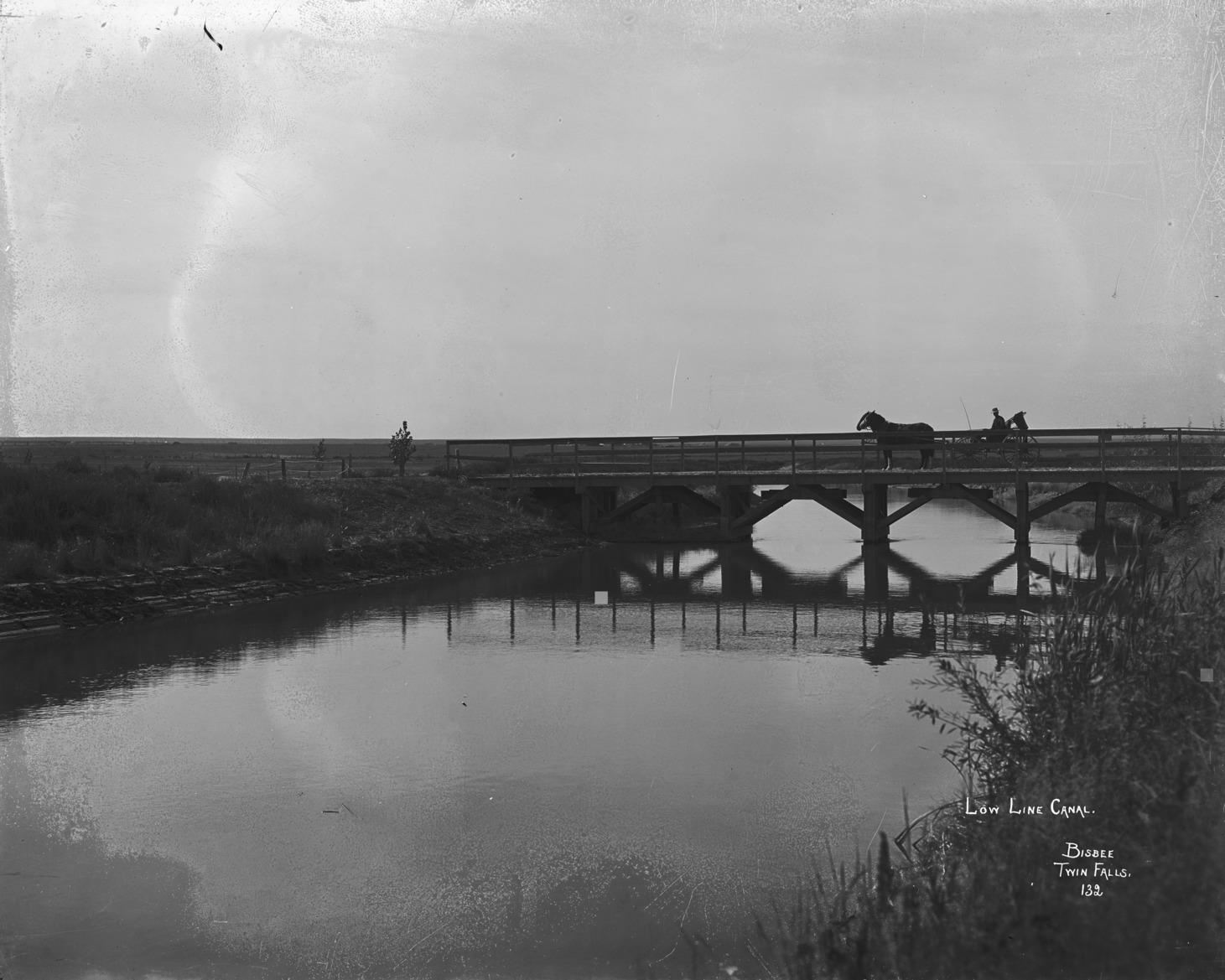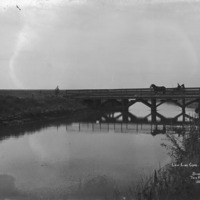 - "Low Line Canal;" man in an a horse-drawn buggy, parked atop a bridge over a canal