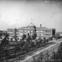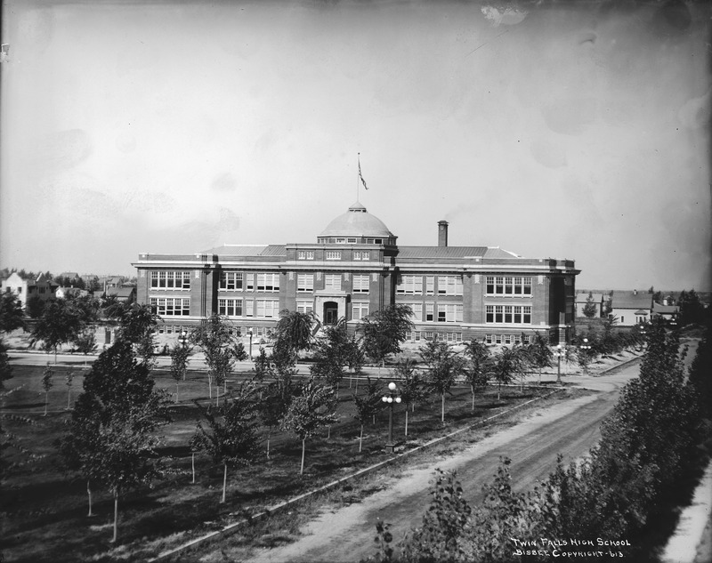 - "Twin Falls High School." Photo also shows a portion of the City Park and surrounding area. The Justamere Inn is visible at the far left.