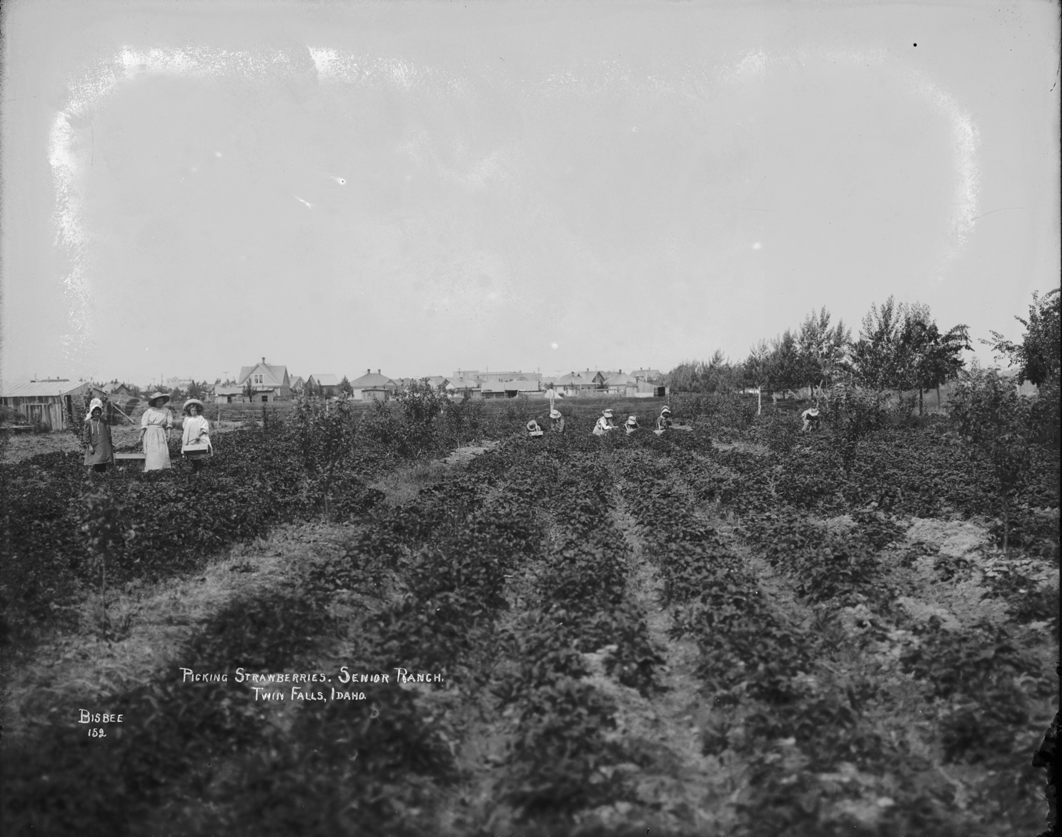 - "Picking Strawberries. Senior Ranch, Twin Falls, Idaho;" Women and girls picking strawberries with townsite in background