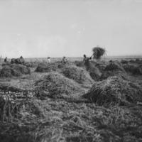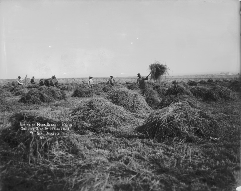 - "Haying on the Mark Bennett Ranch; One mile south of Twin Falls, Idaho; W.T Seal, Overseer;" five men and a team of horses working in a hay field; townsite in distance