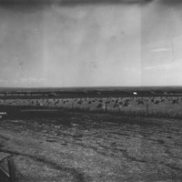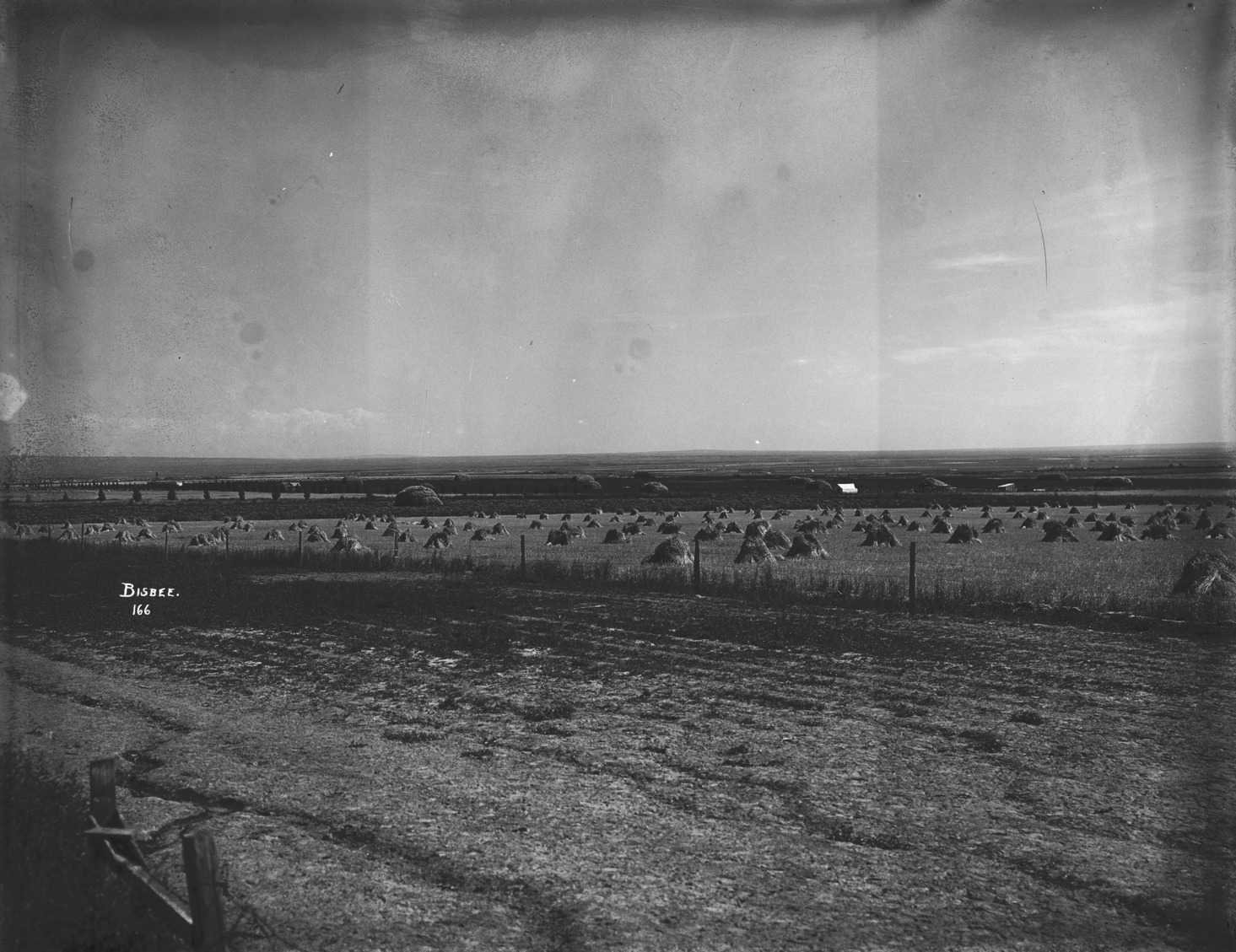 - Several fenced fields of plowed ground, sheaves of wheat, and stacks in the background.