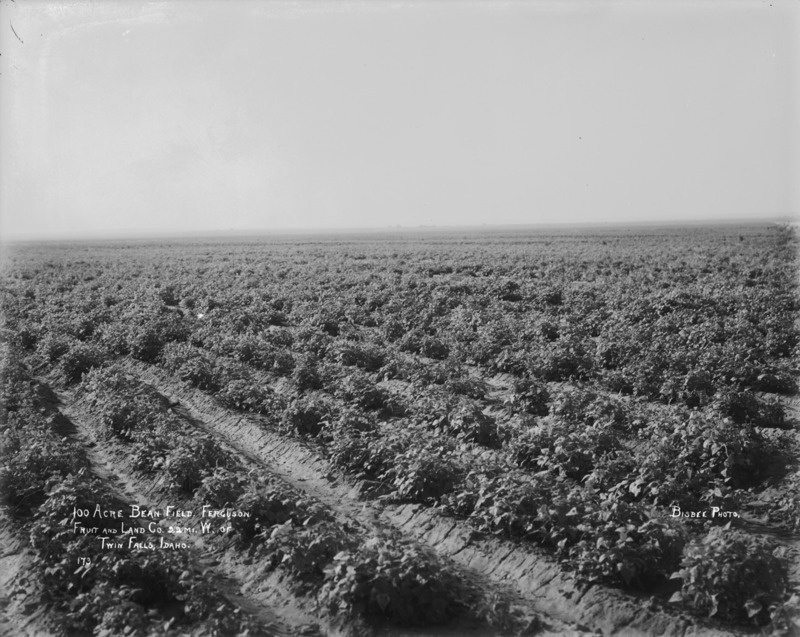 - "100 acre Bean Field. Ferguson Fruit and Land Company, 22 miles west of Twin Falls, Idaho;" large bean field with plants in blossom.