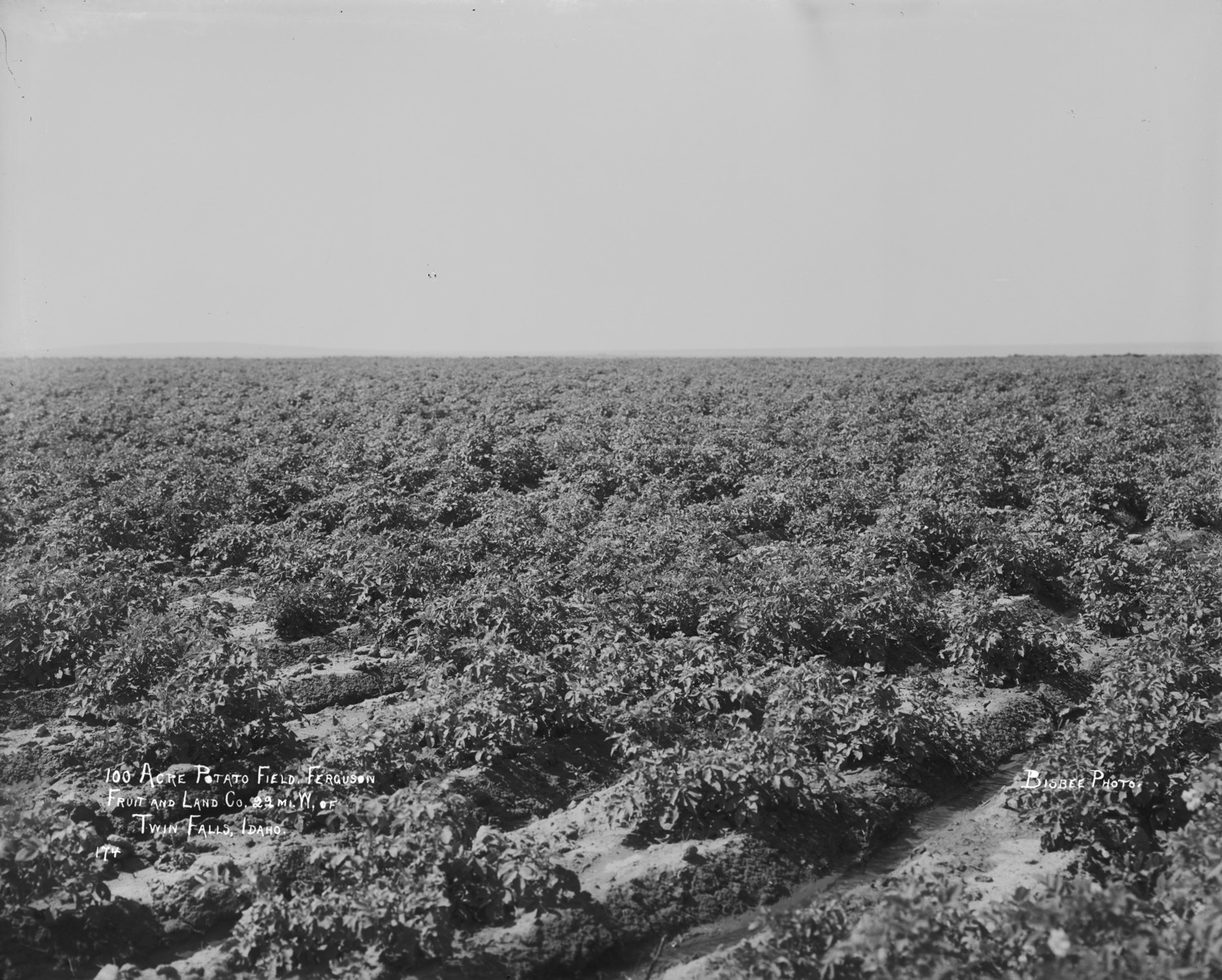 - "100 acre Potato Field. Ferguson Fruit and Land Company. 2 miles west of Twin Falls, Idaho;" large field of potato plants.