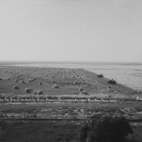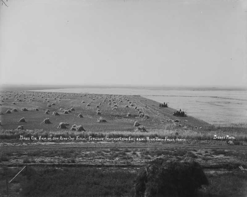 - "Bird's Eye View of a 500 acre Oat Field. Ferguson Fruit and Land Company. 22 miles west of Twin Falls, Idaho;" Two men and two teams of horses harvesting an oat field; another man stacking piles in field