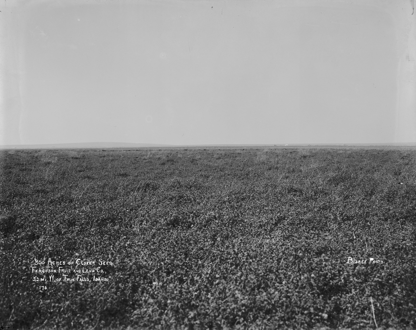 - "300 acres of Clover Seed. Ferguson Fruit and Land Company. 22 miles west of Twin Falls, Idaho;" large clover field.
