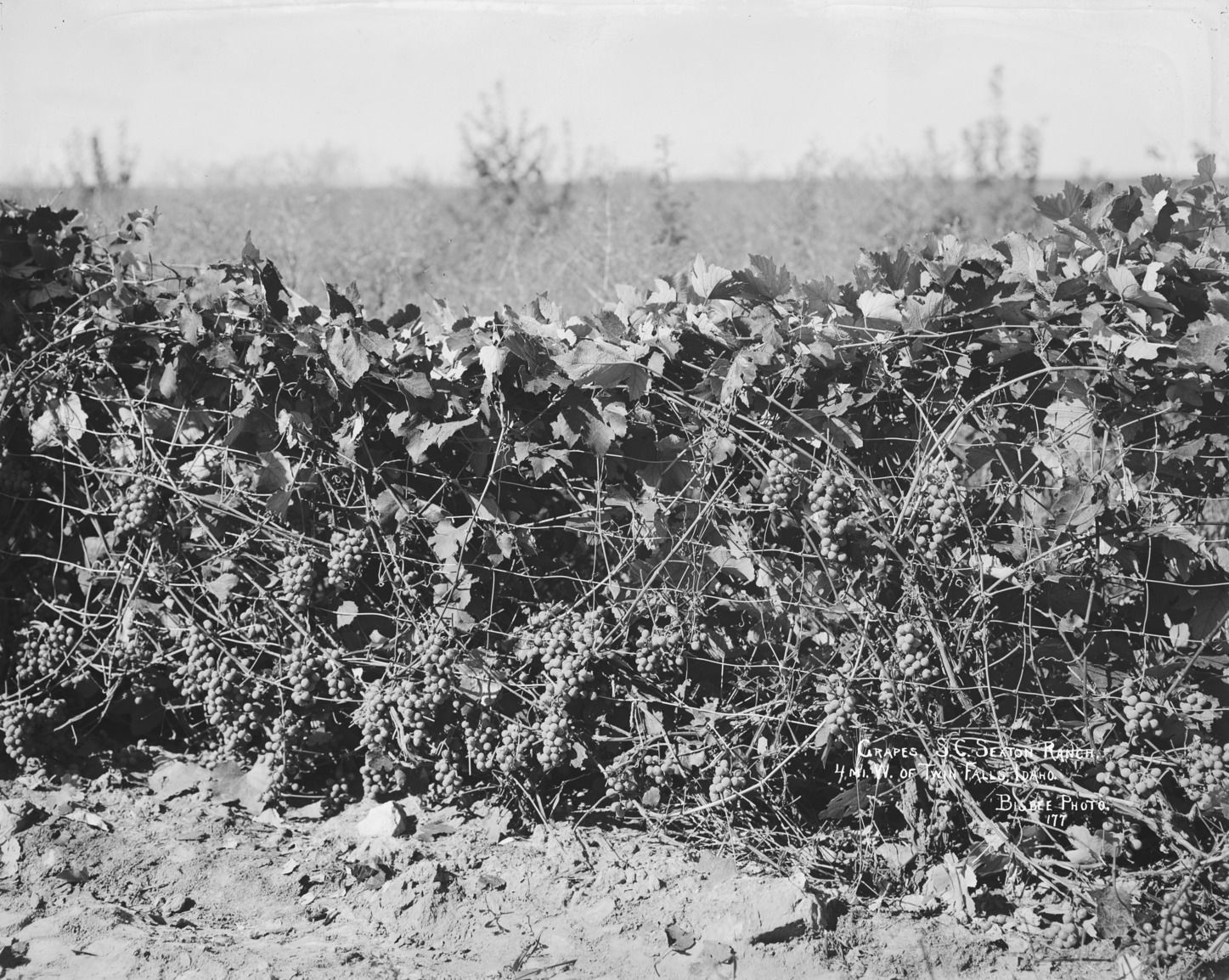 - "Grapes of S.C. Sexton Ranch, 4 miles west of Twin Falls, Idaho;" grapes in the foreground, with trees and farmland beyond.