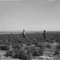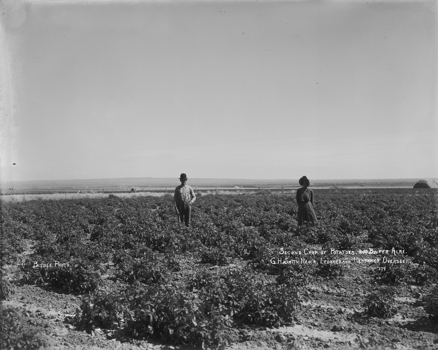 - "Second Crop of Potatoes. 200 bushels per acre. G.H. Smith Ranch. Leonard and Hendricks, Overseers;" man and woman standing in potato field.