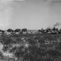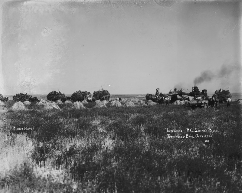 - "Threshing, B.C. Sammon Ranch. Turnipseed Brothers, Overseers;" Eight wagonloads of grain in a line awaiting turn at the threshing machine.