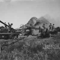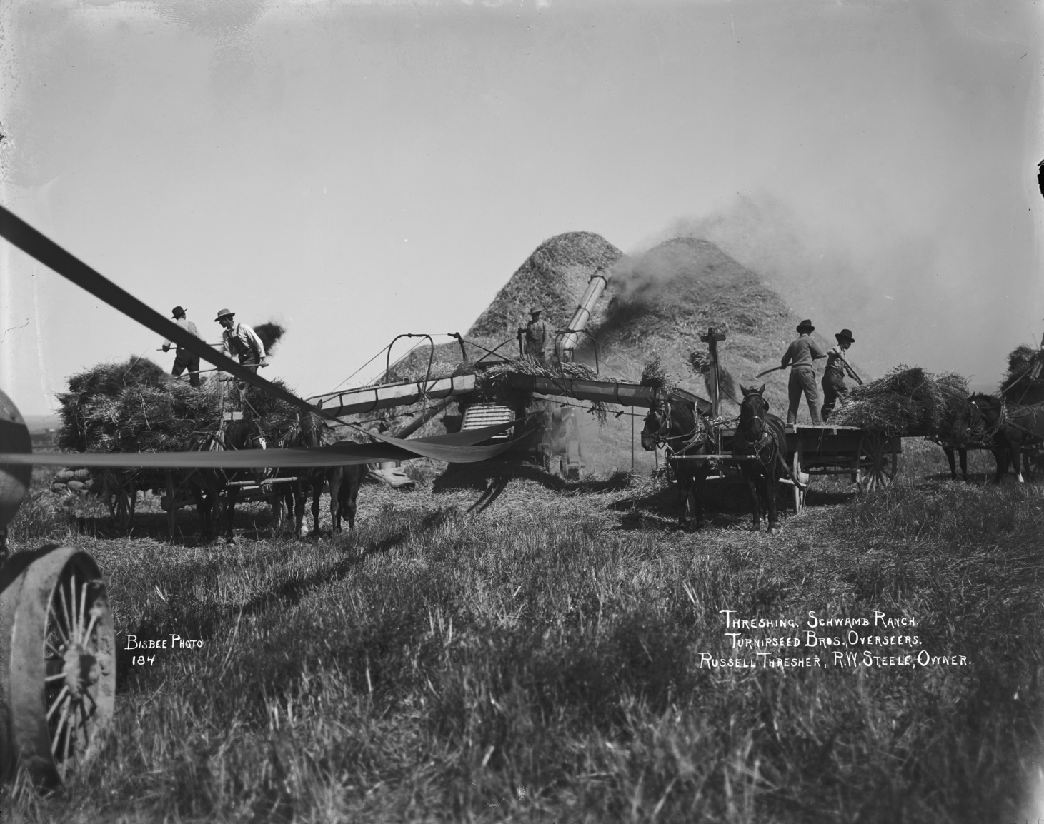 - "Threshing. Schwamb Ranch. Turnipseed Brothers, Overseers. Russell Thresher, R.W. Steele, Owner;" Six men operating a thresher.