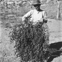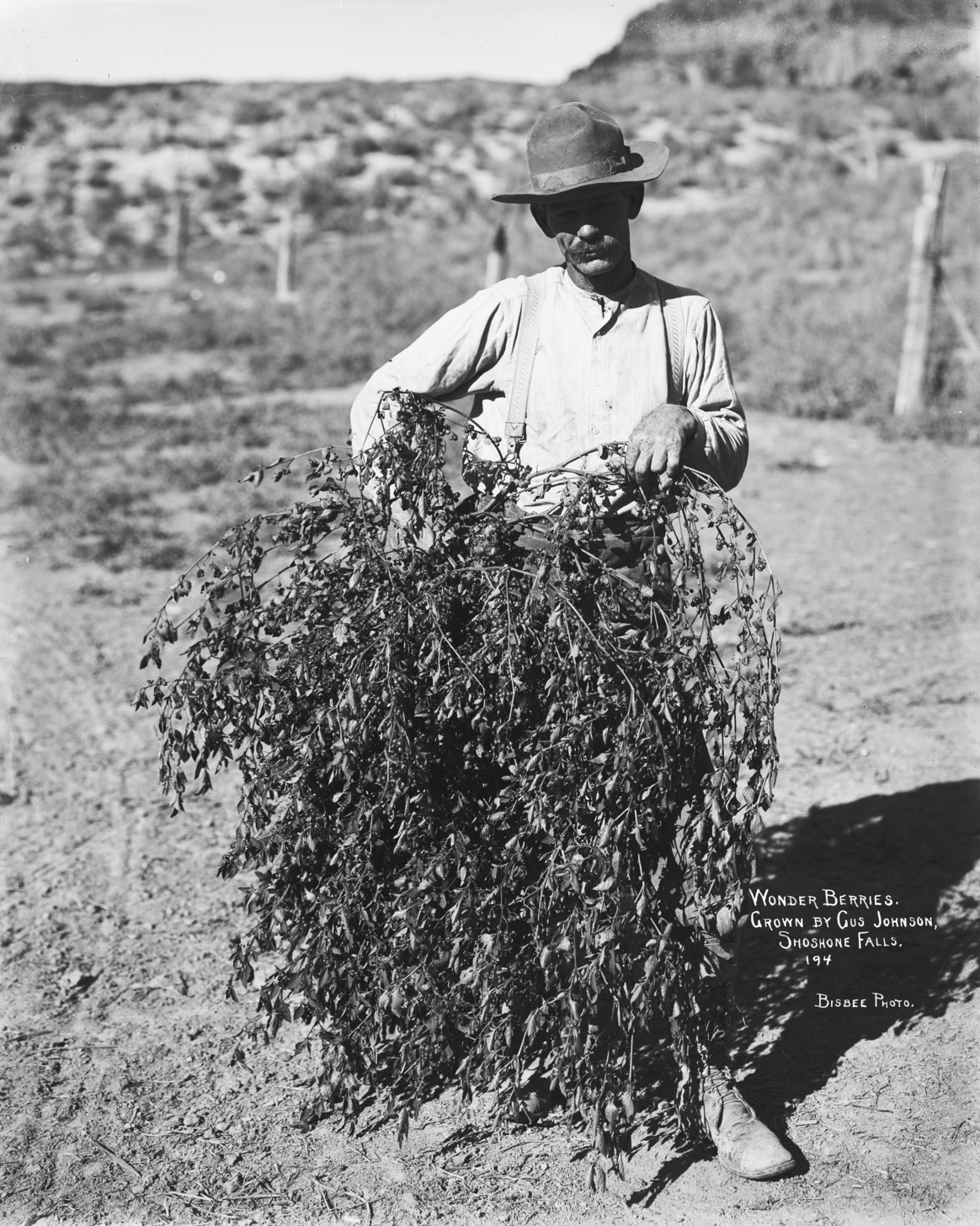 - "Wonder Berries. Grown by Gus Johnson, Shoshone Falls;" man standing in a fenced area, holding a bush laden with berries. Canyon walls visible in the background.