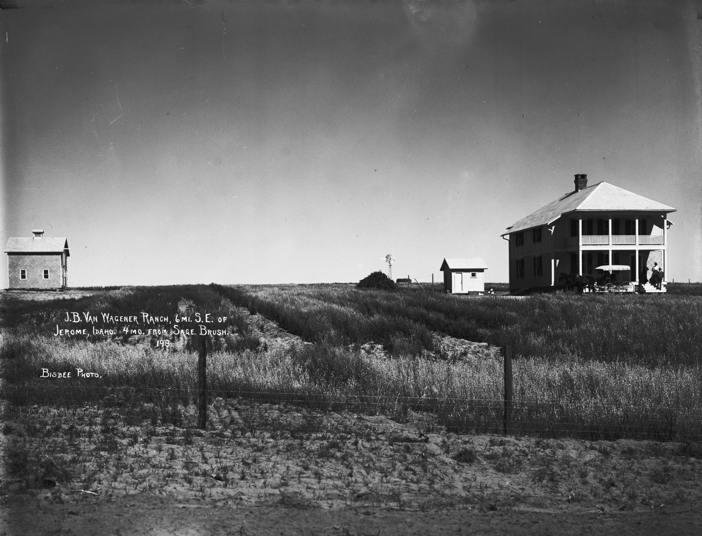 - "J.B. Van Wagener Ranch, 6 miles southeast of Jerome, Idaho. 4 Months from Sagebrush; Two women and a man standing on a porch of a house, with a buggy parked in front; barn, windmill and outbuildings also in view.