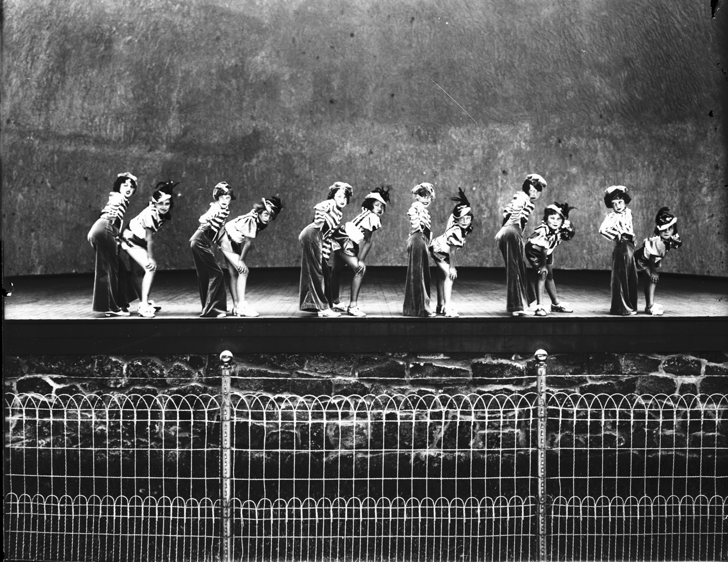 - Children performing on the stage of the lava rock band shell in City Park, which was built in 1934.