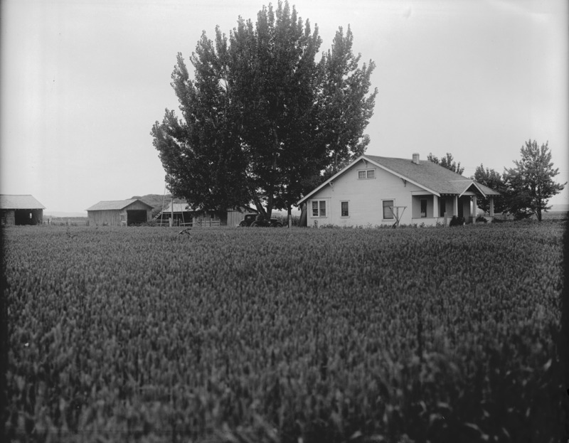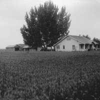 - A farmstead with a large tree shading a white frame house; several outbuildings also seen