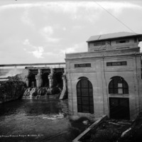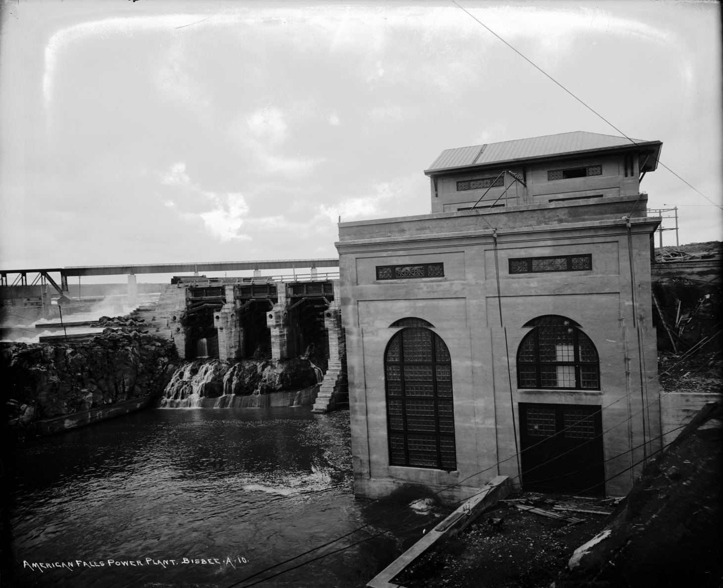 - "American Falls Power Plant;" construction of large stone building nearly complete.