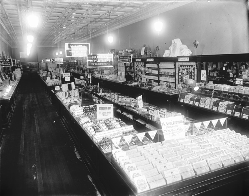 - F.W. Woolworth; Interior, showing merchandise and counters.